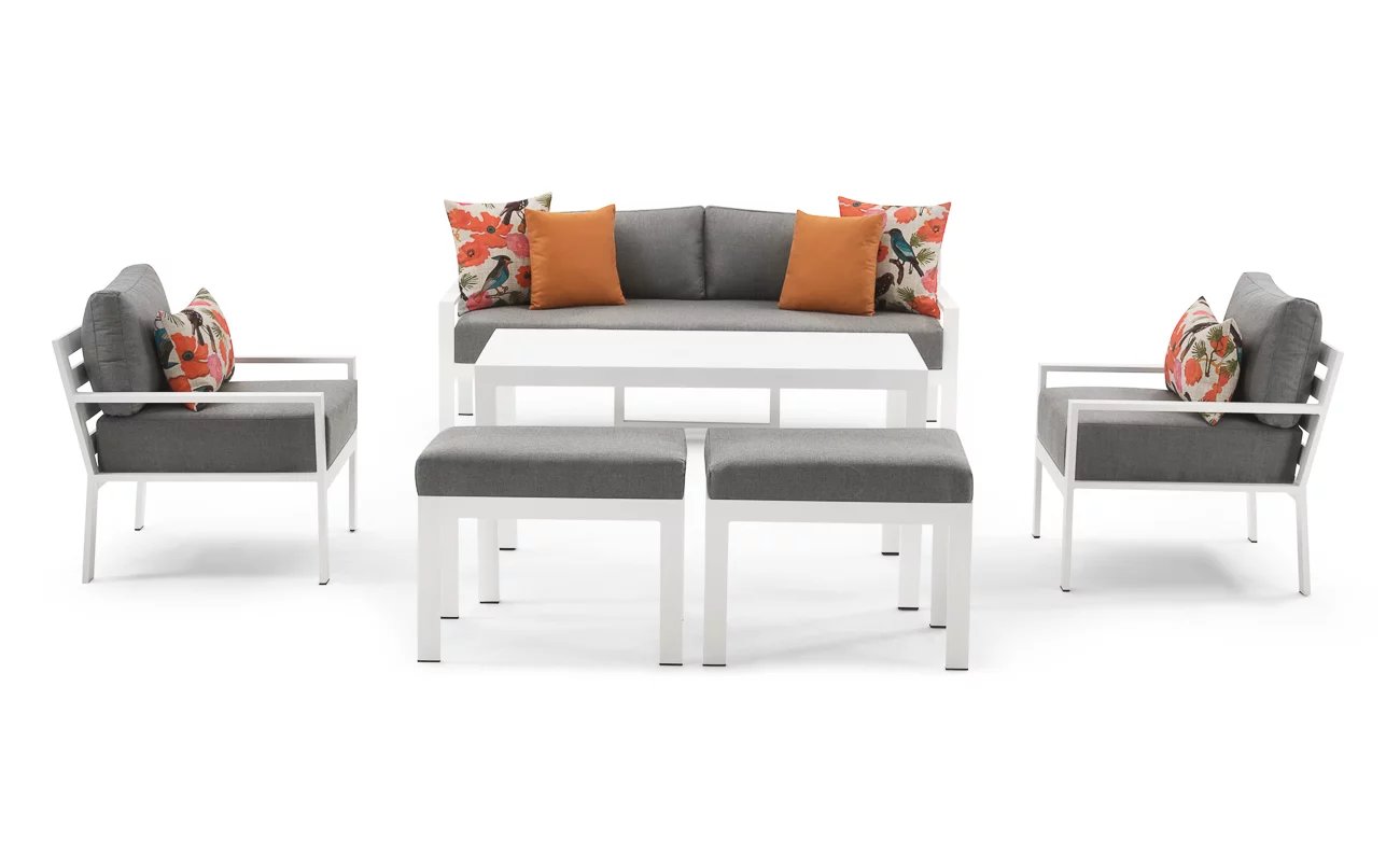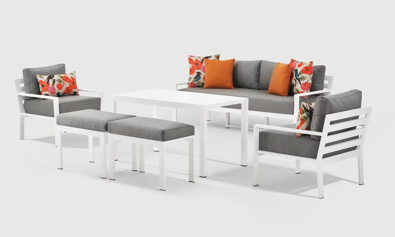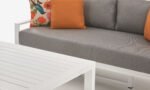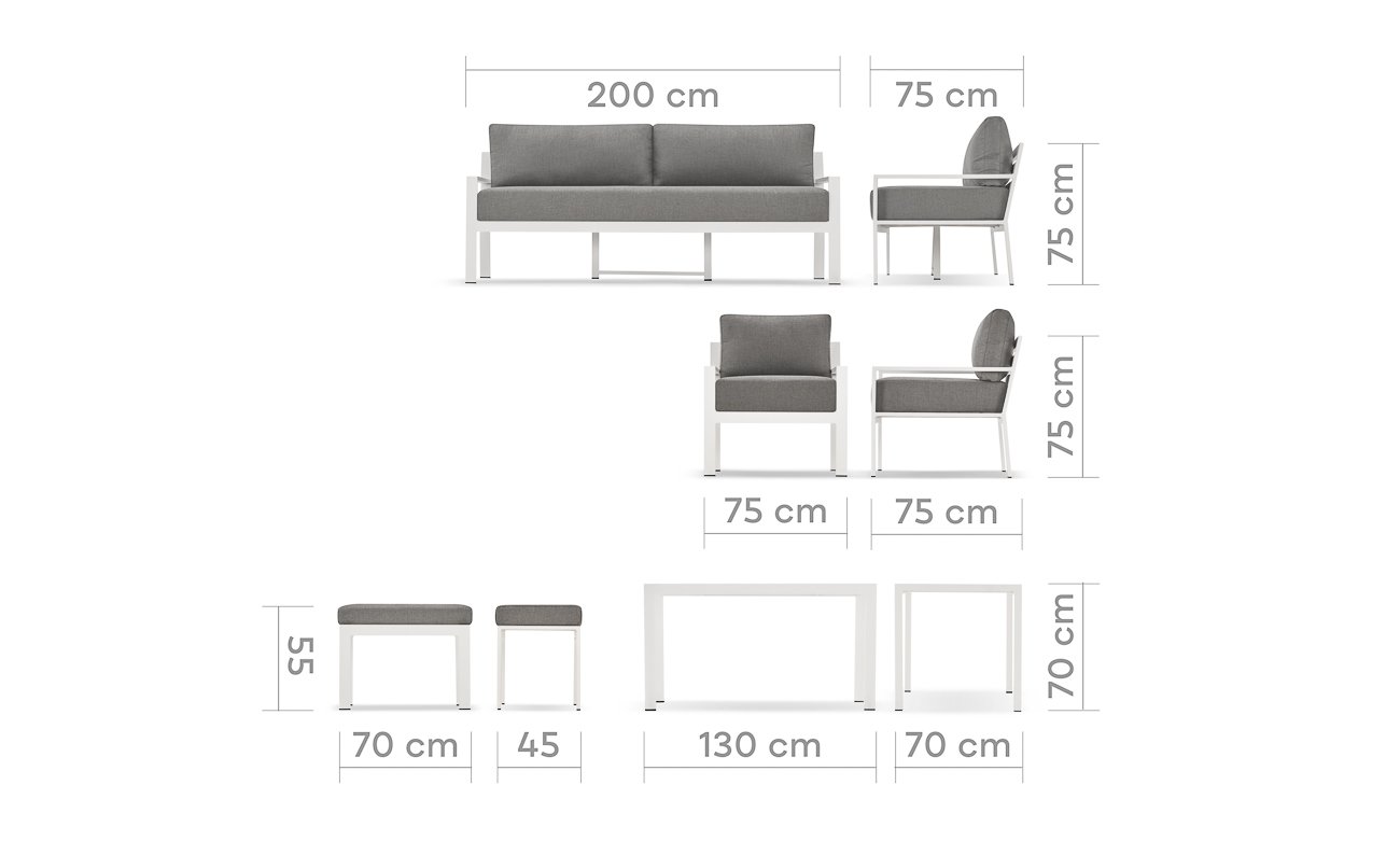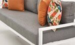 Donnez du panache à votre extérieur avec ce splendide salon de jardin baptisé Taco. Féru du design ? Vous aimerez son armature originale et moderne en aluminium coloré d’une superbe finition blanche. Taco apportera du peps à la déco de votre espace vert. Tapissé d’un tissu outdoor traité anti taches et déperlant, cet ensemble est facile à entretenir. De plus, il est très confortable grâce à son rembourrage en mousse haute résilience. Les coussins contrastent subtilement avec la structure blanche et une touche de jovialité à l’ensemble.